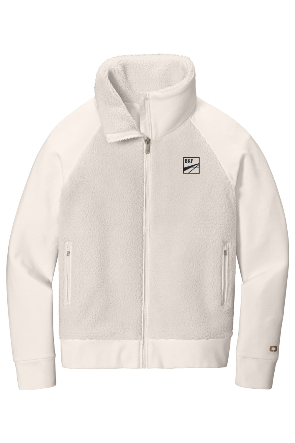 A sherpa fleece body joins performance poly for the ultimate in coziness and mobility.. 13.6-ounce, 100% polyester sherpa fleece body. 8.3-ounce, 52/44/4 poly/cotton/spandex outer collar, sleeves and hem. Exaggerated cowl neck. OGIO heat transfer label for tag-free comfort. Exposed molded zippers with debossed O zipper pulls. O heat transfer on left sleeve. Front zippered pockets.